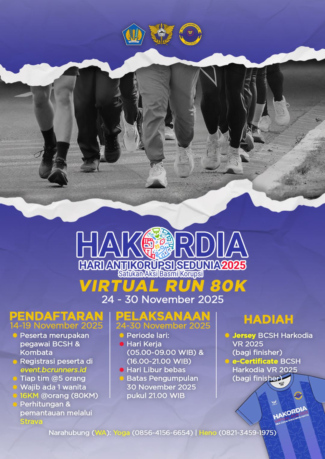 Dalam rangka memperingati Hari Antikorupsi Sedunia (Hakordia) Tahun 2025 yang mengusung tema “Satukan Aksi Basmi Korupsi”, Bea Cukai Soekarno Hatta dan BC Runners menghadirkan kegiatan Virtual Run 80K Hakordia 2025 sebagai bentuk kampanye dan ajakan untuk hidup sehat, sportif, serta menjunjung tinggi nilai-nilai integritas dan antikorupsi di lingkungan Bandara Soekarno-Hatta.