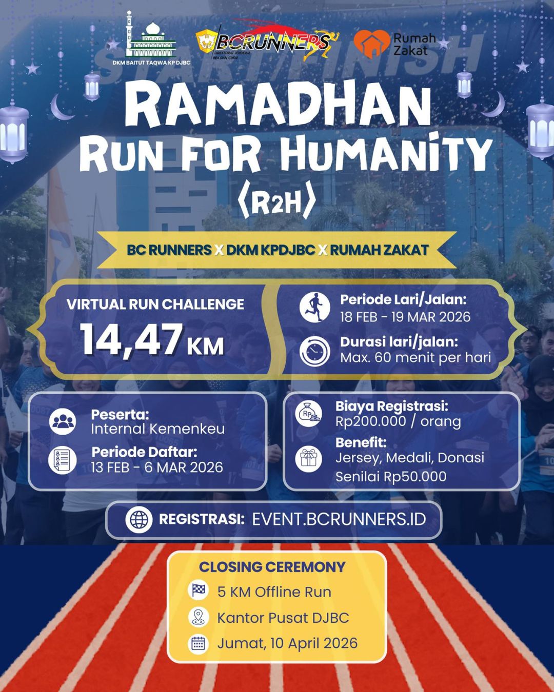 Dalam rangka menyemarakkan Ramadhan 1447 H, BC Runners, DKM KP DJBC, dan Rumah Zakat menghadirkan program yang mengajak Bapak/Ibu/Rekan-rekan tetap aktif menjaga kebugaran sekaligus meningkatkan semangat kepedulian sosial di bulan suci πβ¨